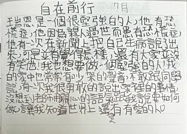 有天,老師發現他竟能安靜坐著,認真寫下人生第一篇閱讀心得。字跡歪斜,卻滿是真誠。