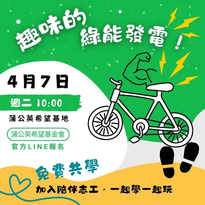 上午10點在「蒲公英希望基地」,透過有趣又好懂的實作體驗,認識綠能發電的基本原理,從動手操作中感受能源轉換的奧妙與樂趣。將以輕鬆互動的方式,引導大小朋友理解電力是如何產生,讓原本看似有距離的科學知識,親近融入生活,進而珍惜能源。